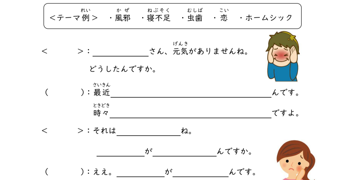 みんなの日本語Ⅱ 31課 会話教材『みんなの日本語Ⅱ』31課 会話練習プリントです。 ※ダウンロードはページの下部(この練習プリントの説明の下)でできます。 またご利用の前に必ず『サイトについて』をご一読ください。 ◆このプリントで練習できる文型 こ